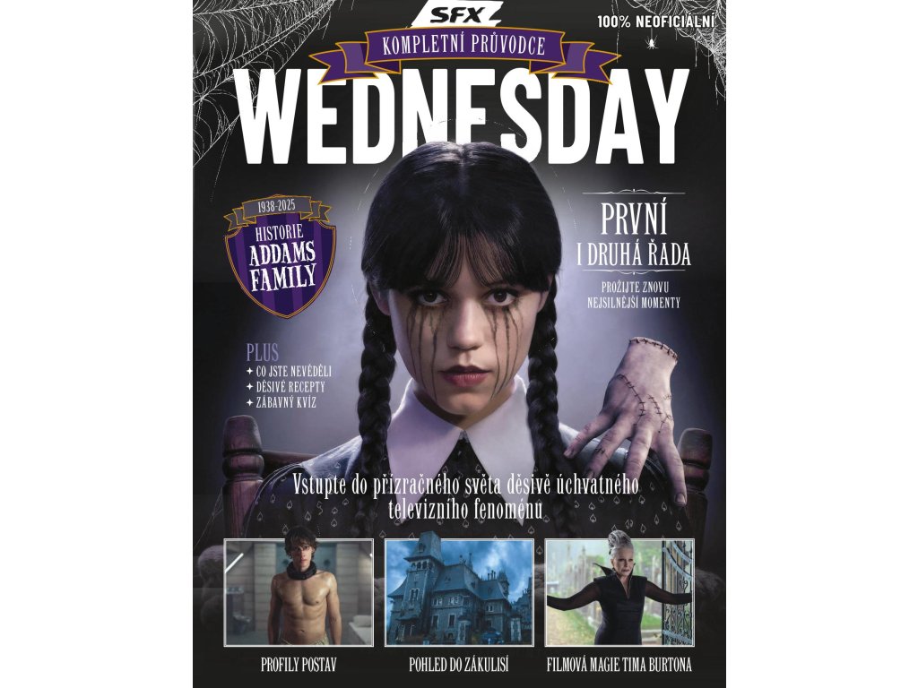 Wednesday Addamsová rozhodně nepatří k typickým dívčím hrdinkám. Chová se odměřeně, nejde daleko pro jízlivou poznámku a čas od času také neodolá experimentům s mučením. Zároveň však vyniká nevšední inteligencí a cílevědomostí, navíc za všech okolností zůstává sama sebou. Copatá holčička si původně získala přízeň publika jako ikonická členka rodiny Addamsových – fanoušci oceňovali její černý humor i nezaměnitelný gotický styl. Když se pak v roce 2022 vrátila na obrazovky jako protagonistka nového seriálu s prvky hororu, detektivky i komedie, zrodil se celosvětový fenomén. Wednesday, nyní dospívající dívka, okouzlila diváky napříč generacemi sarkastickými hláškami, jasnovideckými schopnostmi, svérázným přístupem k řešení problémů nebo třeba virální pohybovou kreací. V našem kompletním, neoficiálním průvodci najdete vše, co jste o Wednesday a jejím světě chtěli vědět. Nescházejí medailonky hlavních postav, návštěva ve filmových ateliérech ani stručná historie Addamsovy rodiny. V temných zákoutích Akademie Nevermore toho na vás ale čeká ještě mnohem víc. Oblečte se do černého, posaďte si na rameno Věc, dvakrát luskněte – a vydejte se po stopách přízračných zločinů.